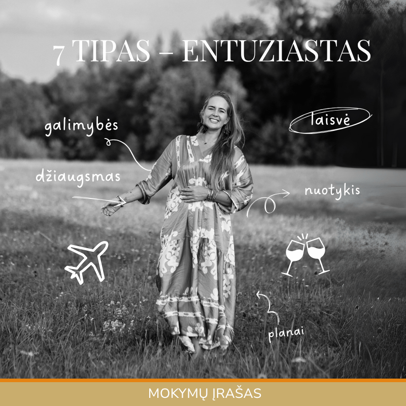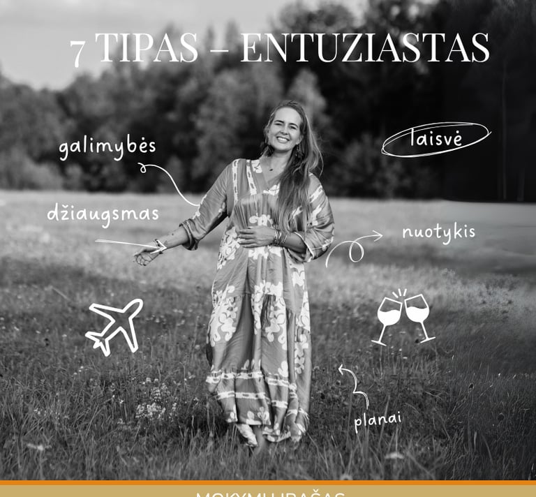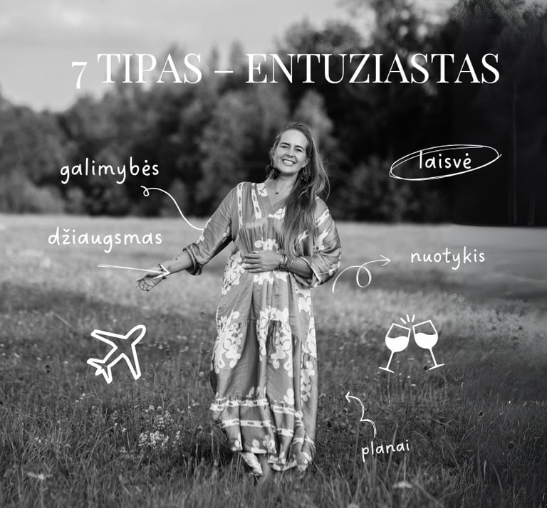 Eneagramos 7 tipas, dar vadinamas „Entuziastu“ arba „Optimistu“, yra orientuotas į malonumų ieškojimą, nuotykius ir pozityvias patirtis. 7 tipo žmonės trokšta išgyventi gyvenimą visapusiškai ir dažnai siekia įvairių veiklų, kurios suteikia džiaugsmą ir laisvę. Jie yra kūrybingi, energingi ir visuomet ieško naujų galimybių bei įspūdžių. Jų pagrindinė motyvacija – vengti skausmo ir neigiamų emocijų, todėl jie linkę nuolat išsiblaškyti malonumais ir pozityviomis patirtimis.