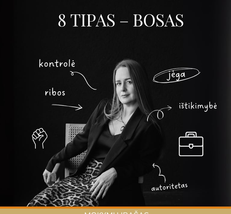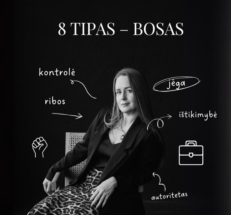 Eneagramos 8 tipas, dar vadinamas „Bosu“ yra orientuotas į galią, kontrolę ir savarankiškumą. 8 tipo žmonės yra stiprūs, ryžtingi ir linkę imtis vadovaujančio vaidmens. Jie nori valdyti situacijas ir aplinkinius, kad apsaugotų save ir kitus nuo pažeidžiamumo. Jų pagrindinė motyvacija – išvengti silpnumo ir kontrolės praradimo, todėl jie stengiasi išlaikyti stiprią ir nepriklausomą poziciją bet kokiose situacijose.